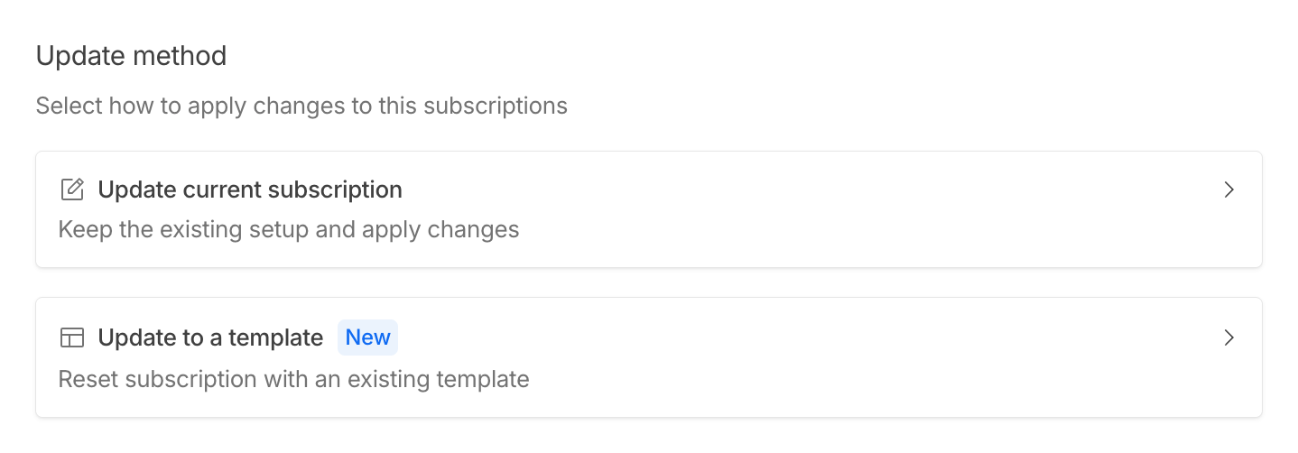 Subscription can be updated by clicking onupdate subscription in the subscription action dropdown.